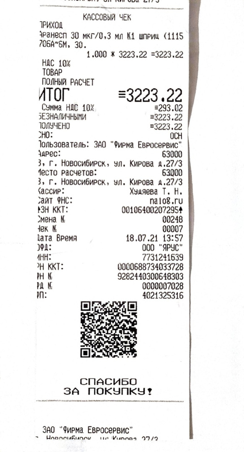 Лекарство Аранесп - 3223,22 рублей.