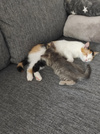Увы, клеймо полустертое, первая цифра не видна. Будем пристраивать, кошка отличная, умная, ласковая, игривая.