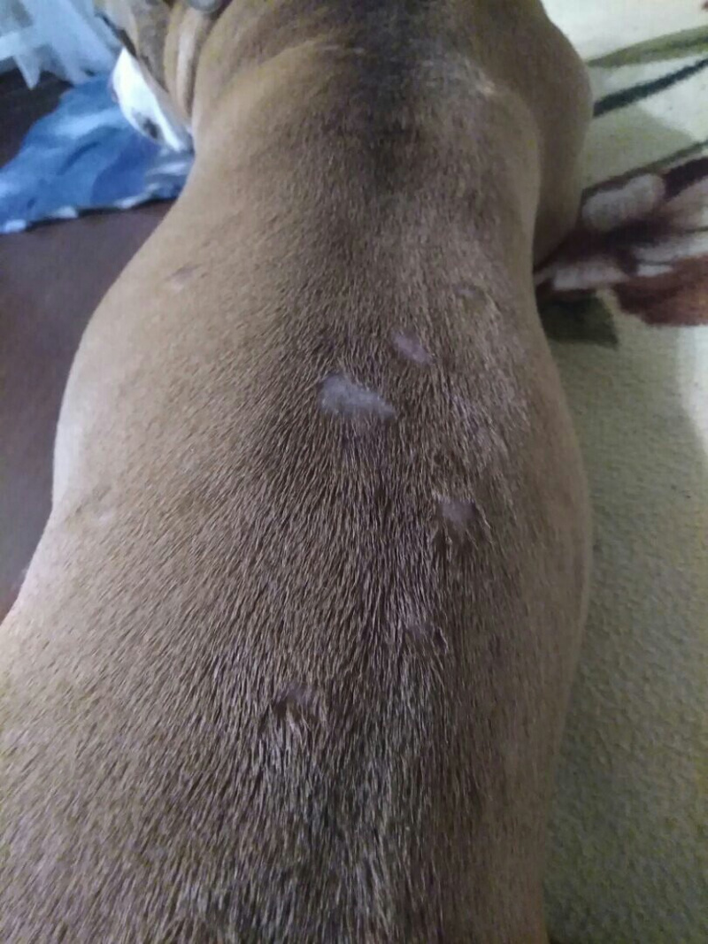 Выглядит это так, словно о собаку кто-то сигареты тушит. Зашибись. В родной ветеринарке взяли корочку на анализ и сказали "Нуууу... Давайте сменим корм! И приходите через месяц."