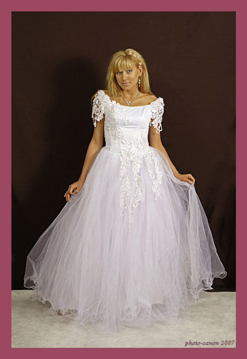На мой вкус, свадебные фотографии надо делать в высоком ключе. Это ведь праздник. Кое-что из сказанного можно в ФШ исправить, благо, хороший контрастный фон. Замени его на белый, убери границу пола и высветли его. Подкорректируй линию бока и убери излишнее пустое место. Если бы можно было переснять кадр, то руки модели лучше соединить в центре, а не растягивать платье с боков. Ну и центральная композиция не самая лучшая. А рамочку подберешь уже потом, в зависимости от полученного результата. Мне кажется, что даже если ты не будешь отдавать новую фотографию заказчику, все равно надо попытаться ее изменить. Ведь мы все на своих ошибках учимся. Успехов!