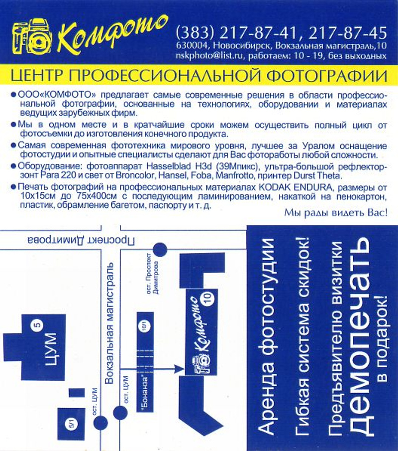 В ответ на: Как они себя называют, Центр профессиональной фотографии, на пересечении пр. Димитрова и Вокз.магистрали. Посоветовали тут же на форуме, сказали, что качество аналогичное по сравнению с ГУТом и Фотолендом на Студенческой. ИМХО, подход более индивидуальный.