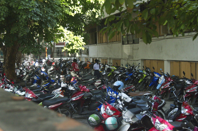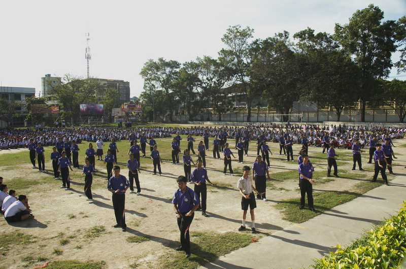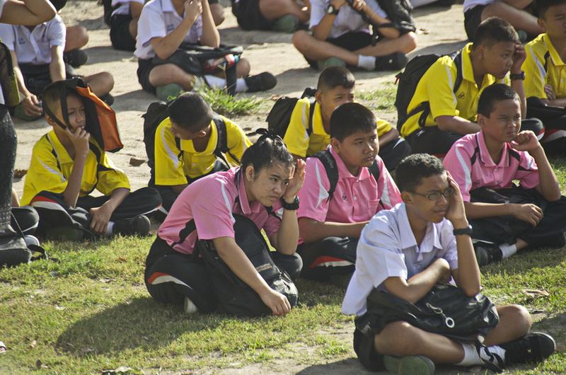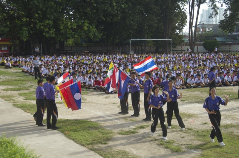 Школа в Тайланде. Начало учебного дня несколько необычно. ( для меня, по крайней мере). Каждый перед началом занятий все учащиеся усаживаются на огромной пришкольной площадке. Сначла воздается должное Будде, а затем традиционное действо, суть которого подружить всех учеников...