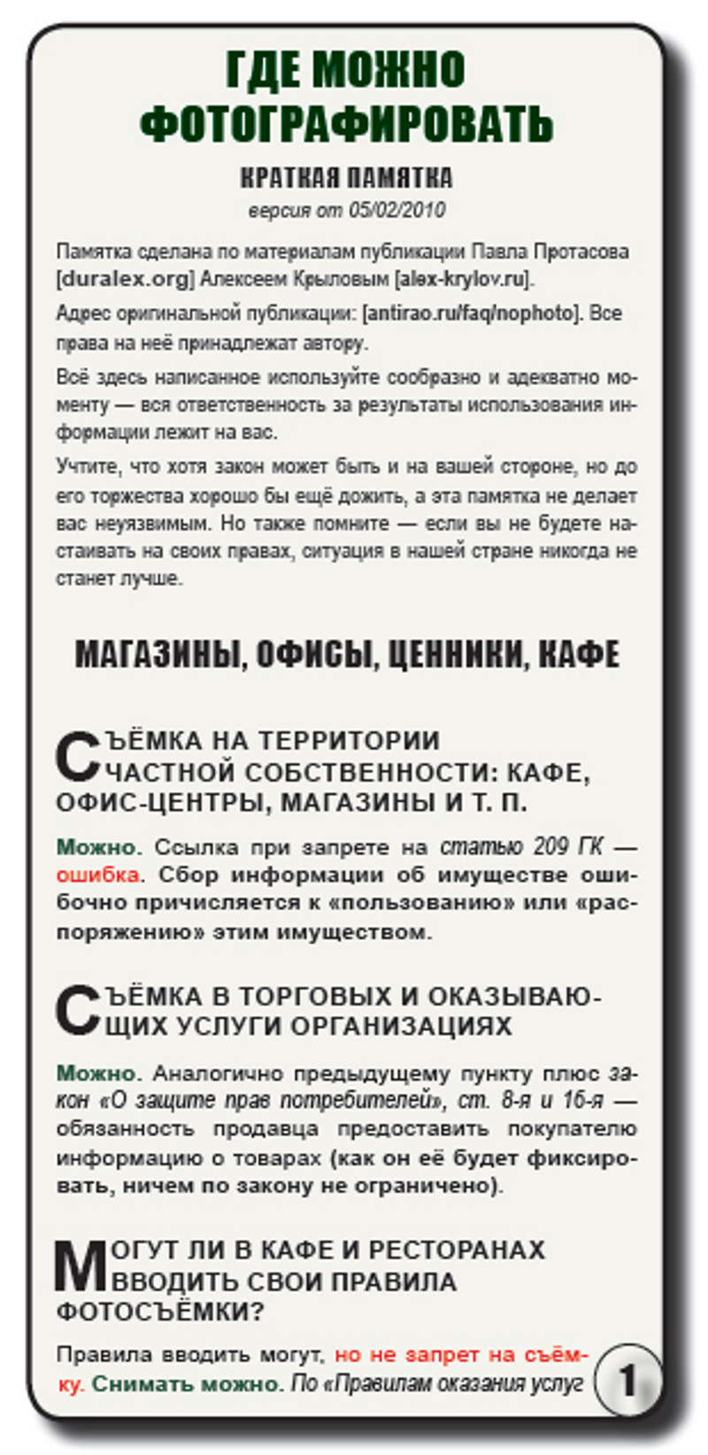 Подборки часто задаваемых вопросов - FAQ о праве на фотосъемку (версия 0.7 от 20 марта 2010 г.)