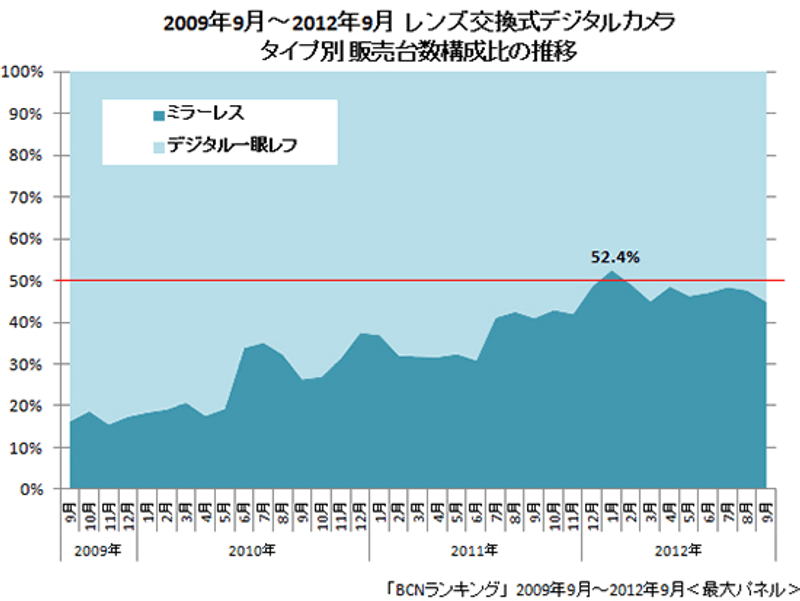 Сравнение с 2009 года продаж зеркалок против беззеркалок в Японии, похоже беззеркалки прошли пик своей популярности (январь 2012) и зеркалки снова их стали вытесянять в продажах.