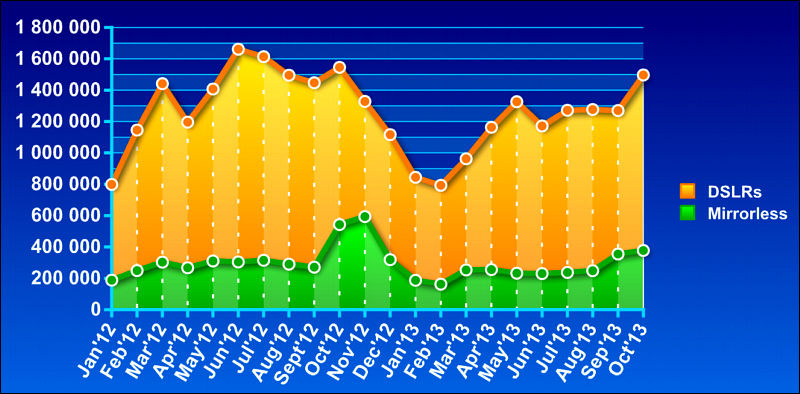 На графике который я приводил выше как раз и видно, в сравнении с зеркалками как беззеркалки отвоевывают постепенно часть рынка.