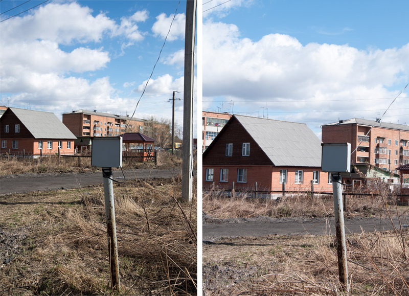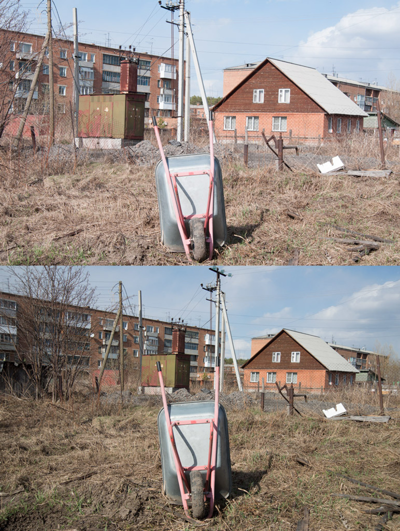Что видим: достаточно легко и здесь увидеть масштабные изменения: сравните размеры тачки и будки электротрансформатора, сравните с окнами домов на заднем плане, с торчащей из земли ржавой колонки.