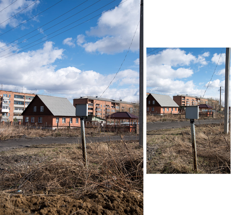 На втором снимке мы снимаем весь кадр таким образом, что бы на обоих аппаратах масштаб телефонной коробки был одинаковым. И видим, что изображения совершенно разные, как будто бы сняты с одного и того же расстояния но объективами с разным фокусным расстоянием, хотя на самом деле объектив один и тот же, а расстояние (от объекта) - разное.