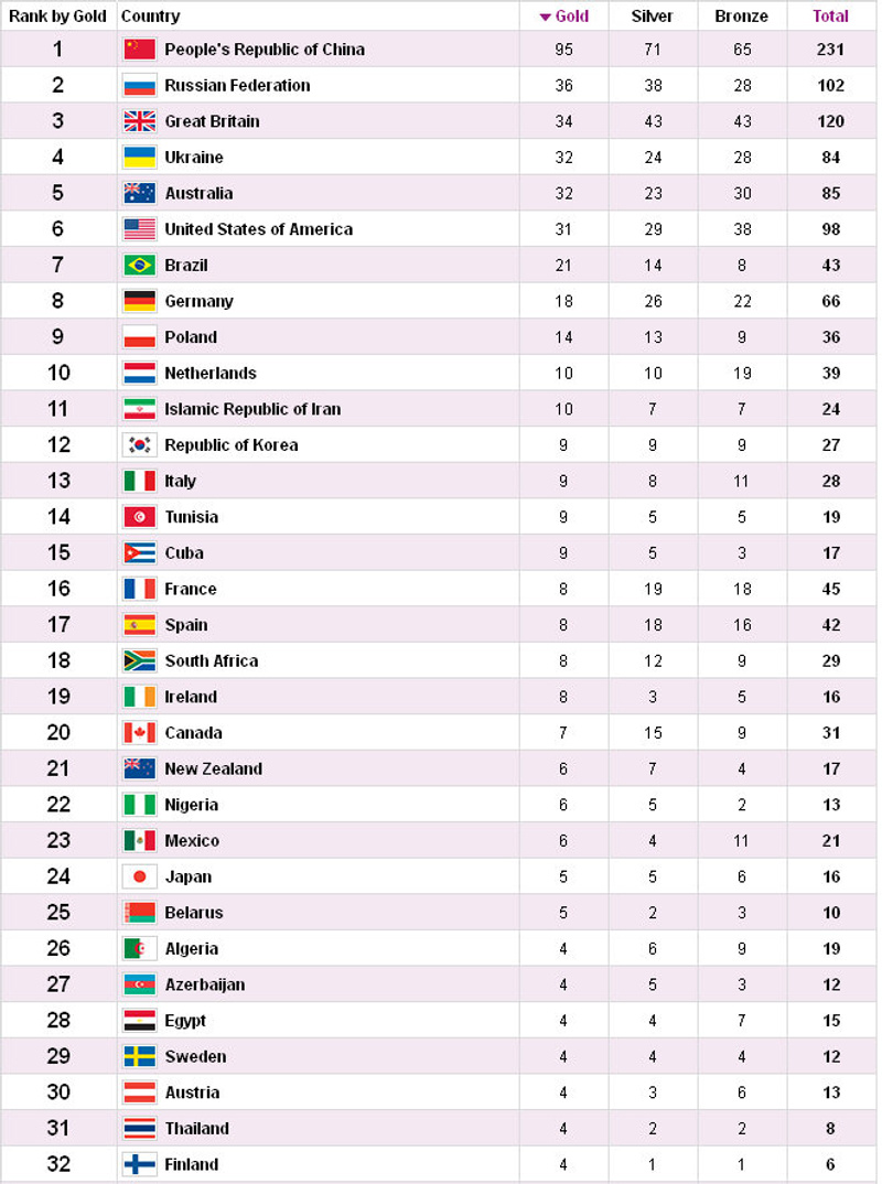Представители Поднебесной в Лондоне превзошли собственный паралимпийский рекорд, установленный в Пекине и равный 88 золотым медалям. На Играх-2012 китайцы 95 раз поднимались на высшую ступень пьедестала почет, 71 - на вторую и 65 - на третью.