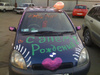 Вот пример сюрприза. Мы делали нечто похожее, но без краски. Просто всю машину другу мишурой обклеивали.вот и пример индивидуальности, я бы на такой "сюрприз" не решилась просто...кому хочется любимую машину исписанной видеть? а потом еще и оттирать?