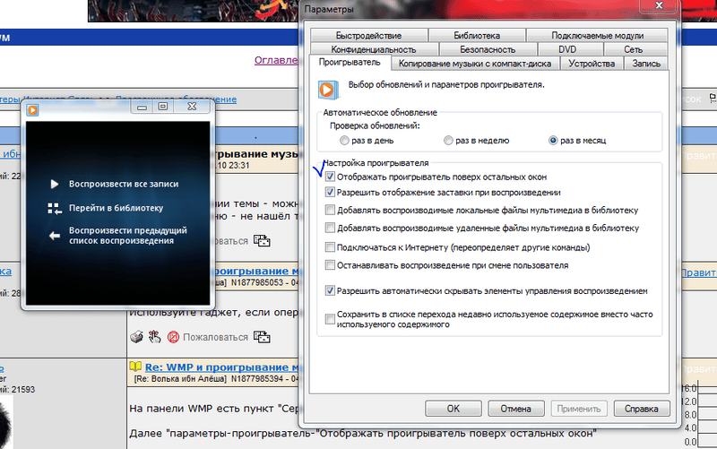Ответ на сообщение WMP и проигрывание музыки/фильмов поверх всех окон пользователя Волька ибн Алёша