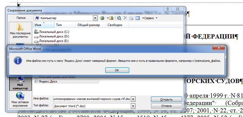При попытке сохранения файла на яндекс диск (например в Ворде), через команду Файл-Сохранить как, и выборе Яндекс Диска (вкладка Мой компьютер) выскакивает такая ошибка. Подскажите как решить проблему (может что в реестре нужно прописать)?