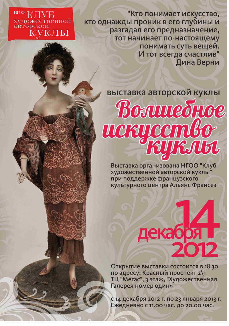 НГОО "Клуб художественной авторской куклы" приглашает посетить всероссийскую выставку – конкурс авторской куклы "Волшебное искусство куклы" посвящённой памяти Дины Верни, которая пройдёт с 14 декабря 2012г. по 23 января 2013г. (ежедневно с 11.00 до 20.00) в Галерее №1 в (Улица Моды, 3 этаж) ТЦ Мегас, Красный Проспект, 2/1 (у автовокзала).