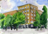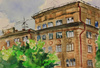 Будем осваивать по-настоящему городской пейзаж: вид с аллеи на здание Сбербанка, ближайшие к нему сооружения. Вспомним (или разучим) что такое линейная и воздушная перспектива, потренируемся в поисках правильных пропорций зданий, и самая малость -- изобразим все в цвете
