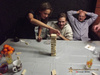 2 - Строиться башня, затем участники игры разбирают ее по отдельным костяшка-блокам, но при этом каждый вытянутый блок устанавливается на верхний ряд башни. Проиграл тот кто завалил башню.