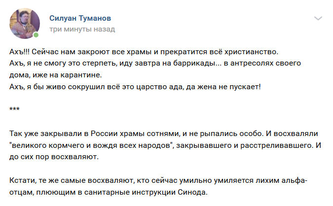 нет, это он про разумные предписания санитарно-гигиенические и рекомендации не тащиться в храм, если простылА жизнь длиннее не становится, и чё нам делать - застрелиться?