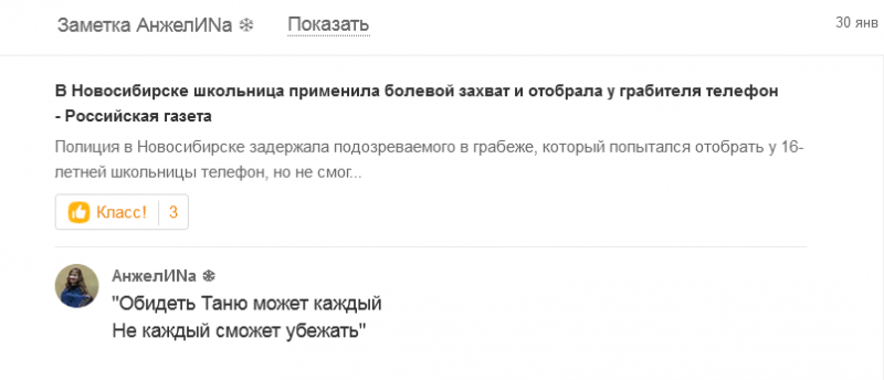 это как Анжелина в ОК разместила новость про девочку что грабителя задержала, щаА жизнь длиннее не становится, и чё нам делать - застрелиться?