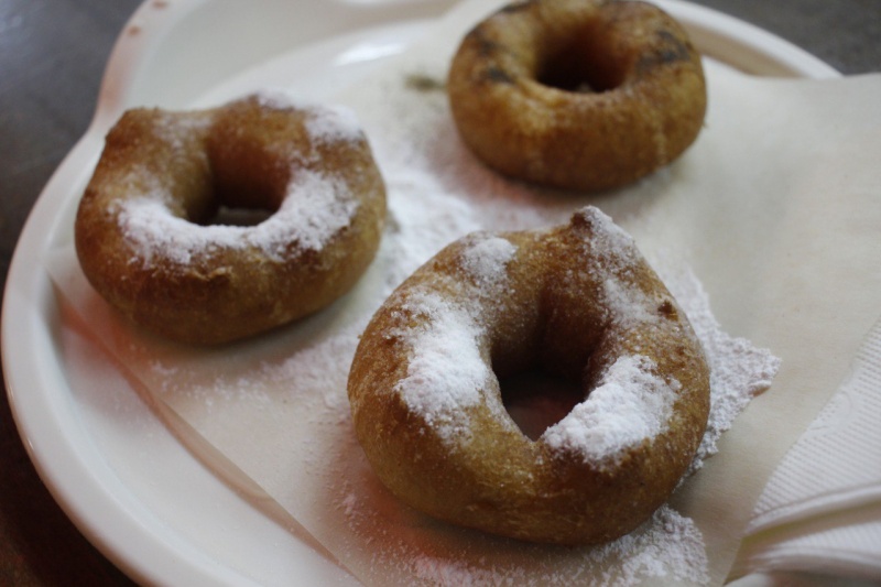 Пробовал только классику, с сахарной пудрой (45 рублей штука), но там есть и с начинками (по 90). И они прямо прекрасные. С хрустящей, местами даже с лопнувшими пузырями, корочкой и нежным содержимым. Которое сочетает органолептическую легкость и достаточно насыщенный вкус. Делают их тут колечками, но довольно толстыми, дырка существенно меньше, чем у американских «донатов».