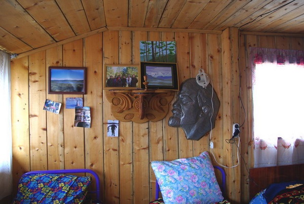 Домик не блещет богатством убранства, но сделан добротно и с душой. Весь в шкурах и охотничьих трофеях.