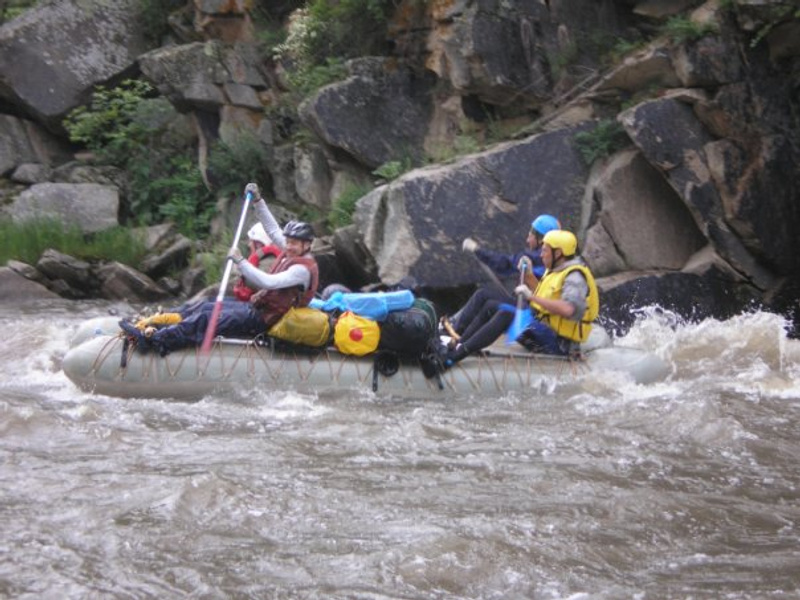 Пяти метровый рафт и 3-и двойки. Шли по всем порогам по полной программе, чтоб мало не показалось))). Перевернуться не удалось нигде, как мы не старались))) Недостаток адреналина восполняли как могли))).
