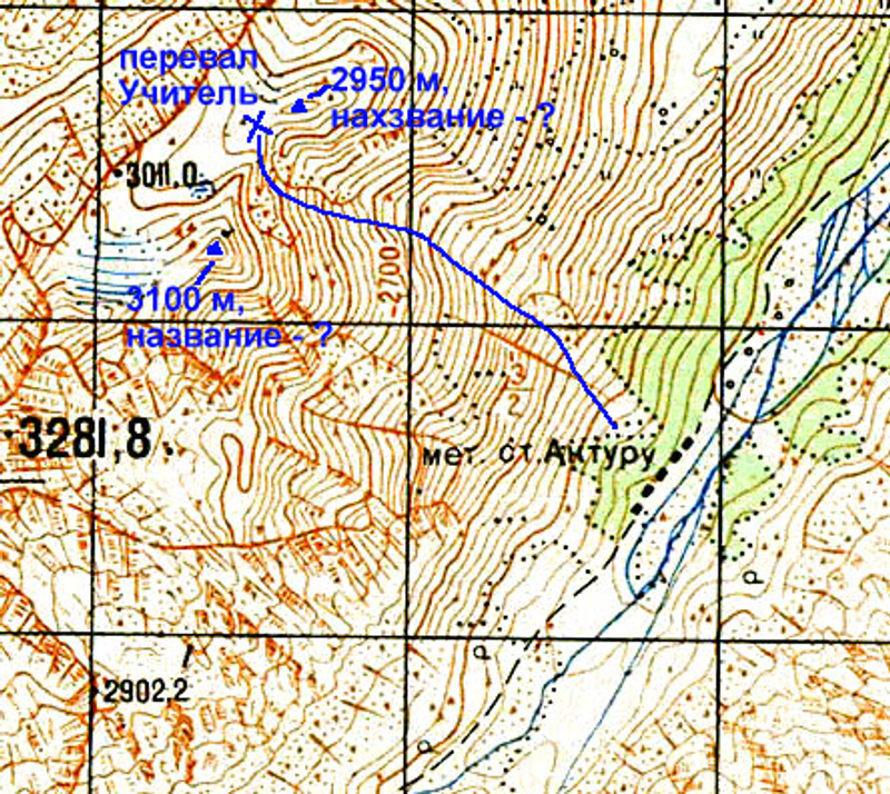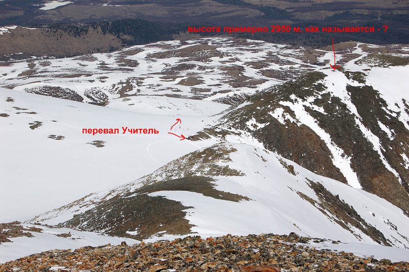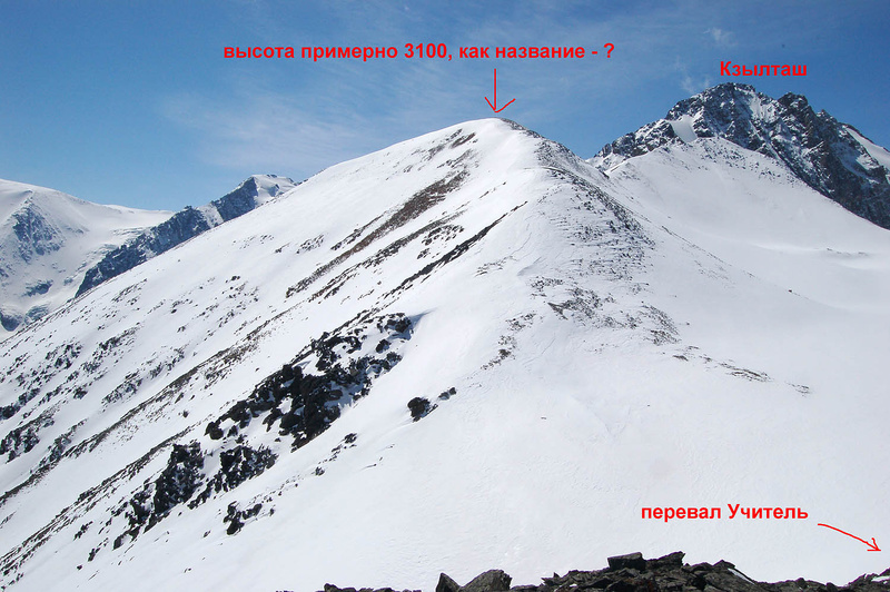 Когда в Актру поднимешься на перевал Учитель от альплагеря, то сразу справа будет небольшая вершинка, приермно 2950 м, а слева вдали в сторону Кзылташа по гребню будет вершинка примерно 3100, кто может знает как они называются?