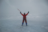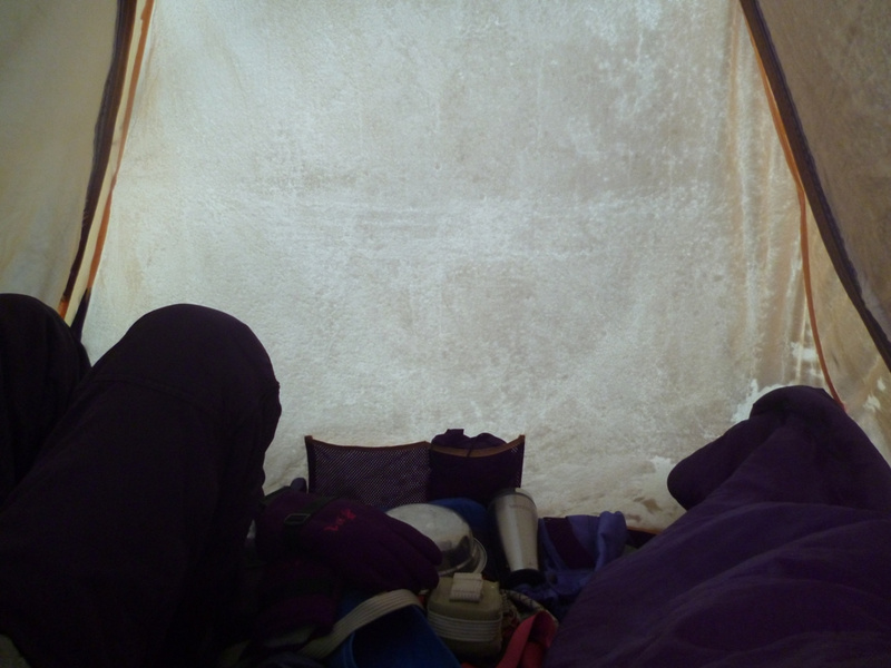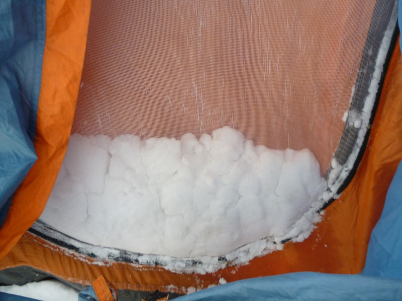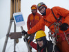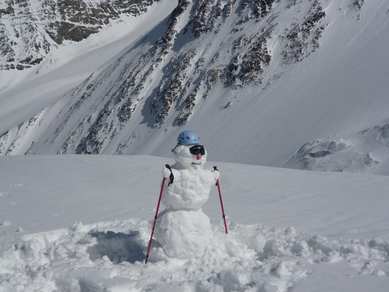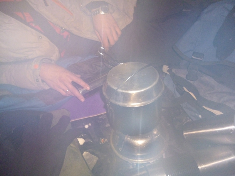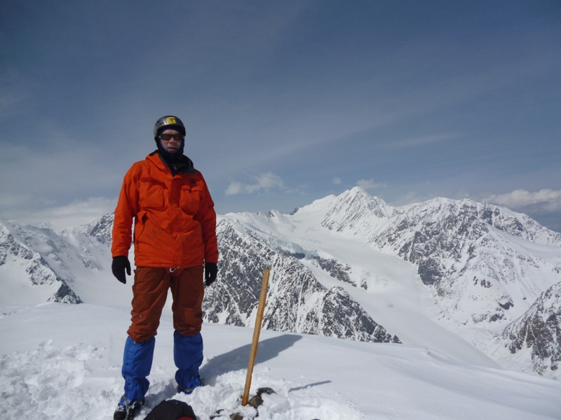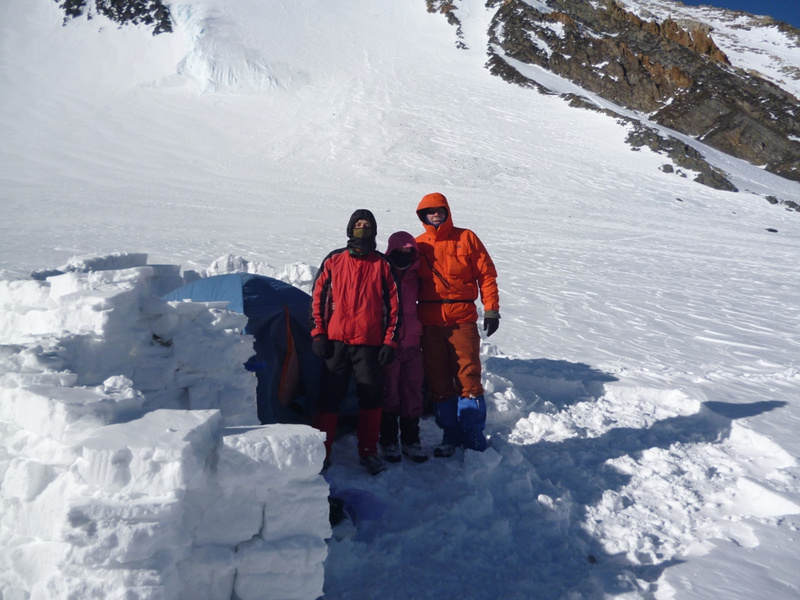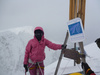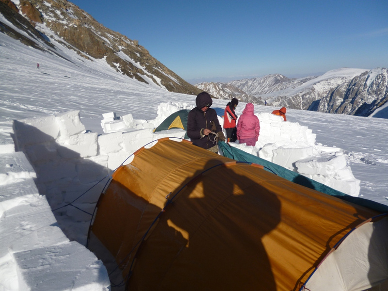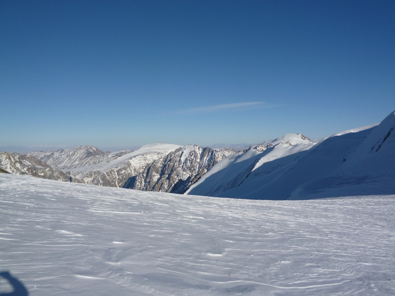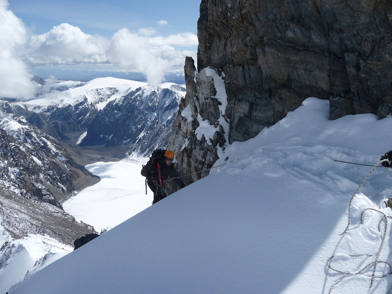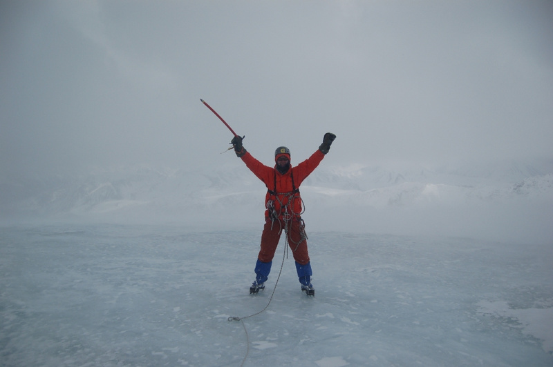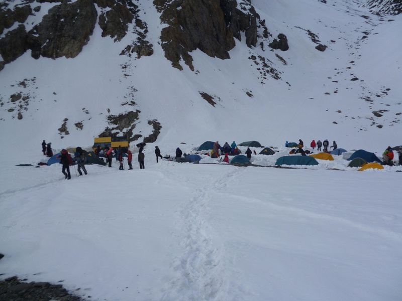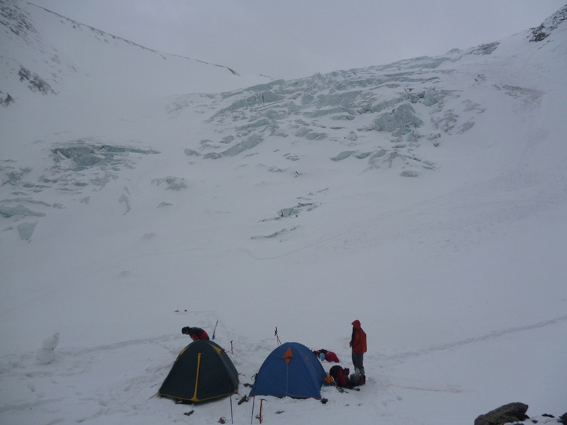 . Удар ветра заставляет лечь на склон, еще 50 метров вверх. Кричу Анди: «-Меняй!». Впереди крутой участок начинаем обходить вправо (позже становится ясно, что это забитый снегом бергшрунд с высокой второй стороной). И вот сюрприз – дальше вверх – лед… Анди ставит первую станцию, принимаем остальных. Прикол дня - у Тезки сломалась кошка (лопнула соединительная планка), ну что ж - дальше на жумаре. Ухожу вверх с веревкой, еще одна станция, «Самостраховка!.. Перила готовы!». С последней веревкой уходит Вэл, по профилю перил стало хорошо видно выполаживание склона. Ура – это вершина! На высоте 3800 м ровное ледовое поле диаметром 50 – 70 метров. Эх, жаль не взяли коньки. Южнее и ниже – плоское снежное продолжение, наверно где то там – тур. Но искать его нет сил. Несколько фоток, видео и вниз… Иду первый и после льда проваливаюсь в этот самый бергшрунд, к счастью только по пояс. Опять бесконечное футбольное поле и отсидки на снегу, в лагере были около 20.00 Восхождение заняло около 12 часов.все ашипки и очепятки зделаны намеряно