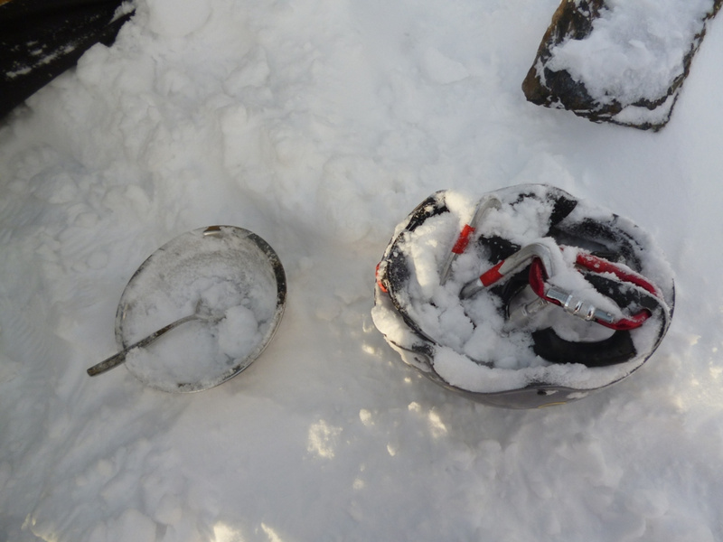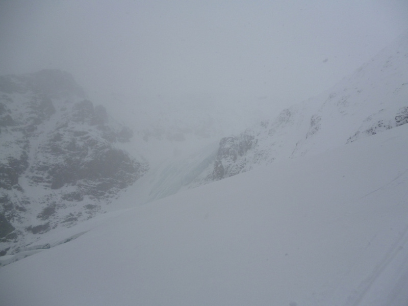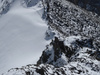 ! Скидываемся по более короткому, но и более крутому маршруту, не доходя жандарма - сразу влево вниз. Участок крутого льда внизу обходим слева по ходу движения, воспользовавшись ледобурами, любезно оставленными одной из поднимавшихся групп.