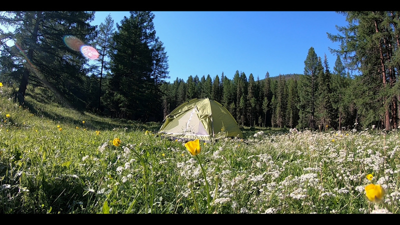 Время приближалось к 9-ти, и хоть это был один из самых длинных световых дней в году, в горах темнеет раньше. Проскочив деревню я проехал еще один-два километра и стал судорожно искать ночлег, попутно отказавшись от еще одного места. Вставать в темноте, когда тебе нужно вытащить кучу вещей из рюкзака и установить палатку — занимает в два раза больше времени (даже с фонариком), а еще я хотел успеть что-то снять, ведь это мой первый вечер в Долине Чулышман! Так что я пренебрег несколькими “принципами” поиска места и спустился в низину к реке. Там было ровно и ещё были деревья, такие нужные моей тоненькой сырой палатке, чтобы укрыть от дождя, который приближался с большой черной тучей. Также были и камни (которые я расчищал для места под палатку) и тихая речка. Вставал я второпях и совсем не успел насладиться вечером. Устал и скрючившись в палатке готовил себе ужин. То еще удовольствие, когда весь день гнул спину. Но Долина ведь с особенной энергетикой, правда? За проделанный путь она наградила меня спокойной ночью, а за ней и ясным утром с голубым чистым небом. Наступал новый, насыщенный день.