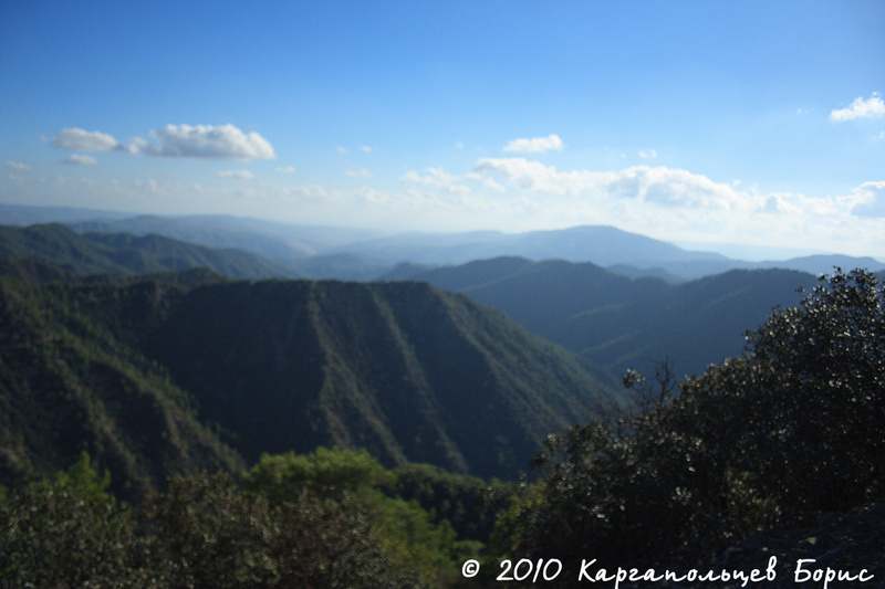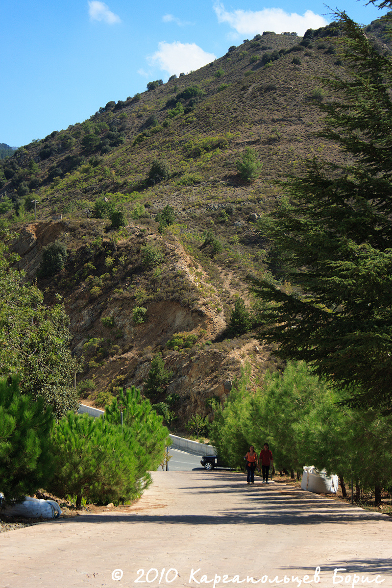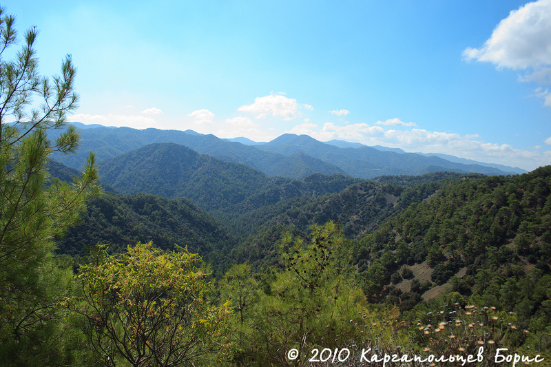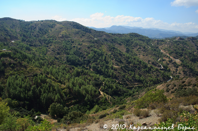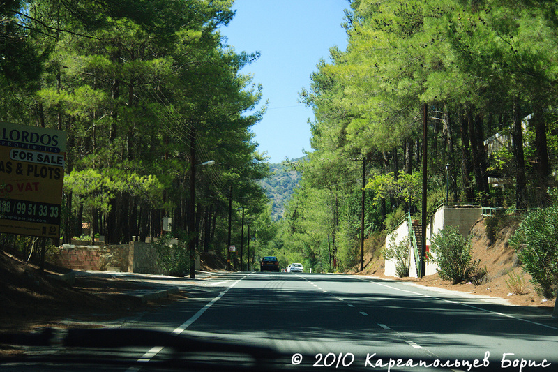 Пункт №1 нашей поездки - горы Троодос. Вся растительность Кипра сосредоточена преимущественно в горах - чем выше в горы, тем больше. Растёт много сосен с приплющенной макушкой, встречающихся только на Кипре. В горах был привал у торговых лавок - тут продаётся отличное местное вино Erotica Commandaria (красное десертное), обладающее мягким свежим вкусом. По такому случаю нам удалось сторговаться за 38? за 6 бутылок - торг вполне уместен. Также здесь можно найти сувениры/местные сладости/орешки в меду и прочее-прочее-прочее не менее интересное.