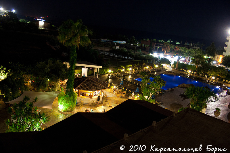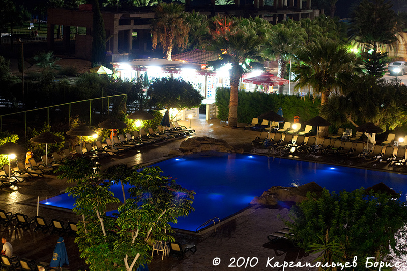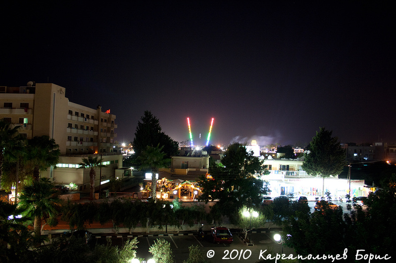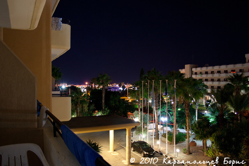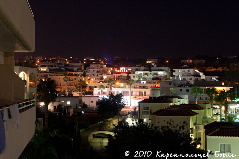 После посадки стандартные процедуры - регистрация, получение визы по предъявлении провизы и всё остальное. Сам аэропорт Ларнаки не сказать чтобы был большим и интересным - очень похож на ангар. С нашего рейса Натали Турс забирал много пассажиров - около 50 человек, приготовив большой автобус. Заполошная девушка-гид с забавным акцентом всем выдавала пухленькие рекламные брошюры с перечнем экскурсий и прочего-интересного. В пути нам включили диск с часовым фильмом и рассказом о Кипре. Дорога до Айя-Напы заняла тот же самый час, причём автобус нёсся где-то 100-120 км/ч при ограничении в 100 км/ч. Такая скорость на междугородних хайвеях считается здесь нормальной, меньше никто не ездит. Транспортная разметка вся очень логичная и удобная. Начинаешь ориентироваться практически сразу. С хайвея мы съехали уже в саму Айя-Напу по Nissi Road. За окном уже 9 часов вечера, так что ночная жизнь в самом разгаре - повсюду огни, неон, вывески, рекламы, прогуливающиеся туристы, магазины, забегаловки, пабы и прочая и прочая. Вот он - ночной город!