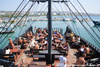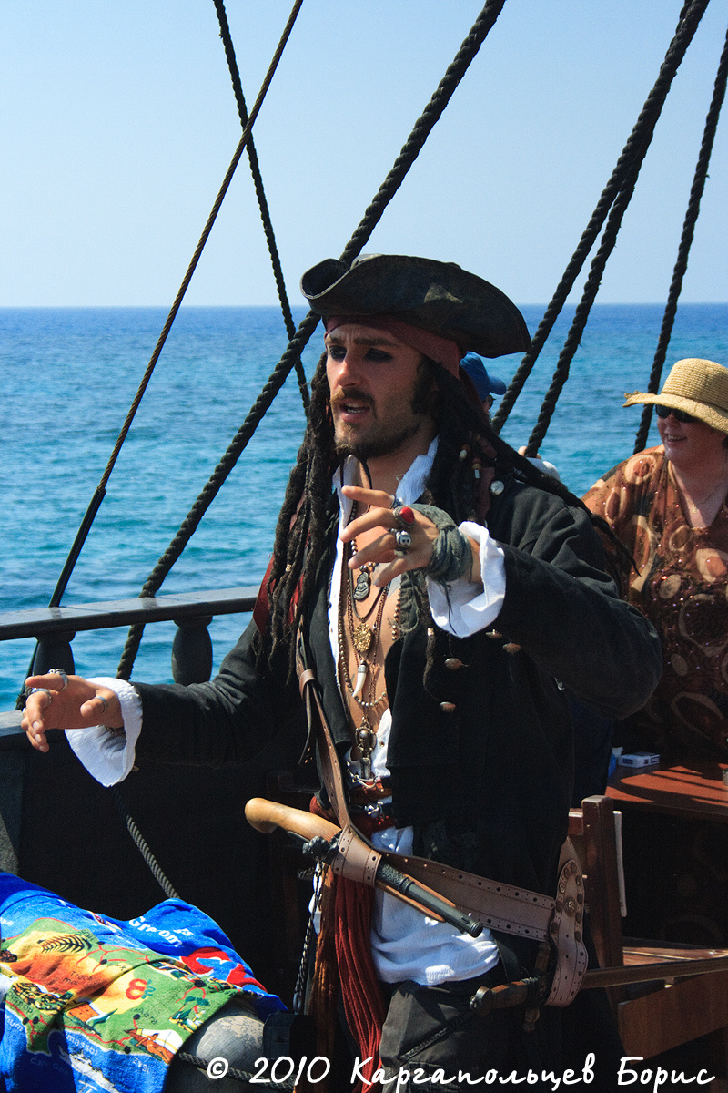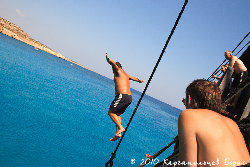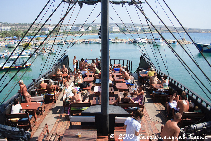 На острове левостороннее движение - поначалу неудобно, но быстро привыкаешь. Можно без проблем взять в аренду авто, квадроцикл или мотороллер - обойдётся дешевле. Светофор в городе всего один - на пересечении Нисси Роад и Авеню. Несмотря на это, правила никто не нарушает - все ездят спокойно. На Кипре, как рассказывали, всё наоборот - если человек пьяный он будет ехать наоборот медленнее, аккуратнее, а гоняют только трезвые лихачи-русские )) Менталитет другой уже. Из интересного в городе - небольшой парк аттракционов, самые интересные аттракционы - рогатка (кабинка на двух человек, которую запуляют вверх) и молот. Есть ещё автодром - привет из детства. В порту можно за умеренную плату купить экскурсию на большой яхте или даже на имитации парусного пиратского судна Black Pearl (Чёрная Жемчужина, приямком из пиратов Карибского Моря.). На больших яхтах экскурсия стоит в районе 15-20?. На Чёрной Жемчужине - 35?. Жалеть 1200 за экскурсию на Чёрной Жемчужине не стоит - деньги небольшие, а веселья и удовольствия получите море - один только "вечно бухой" Капитан Джек Воробей чего стоит. Можно смело брать и детей - для них там отдельные конкурсы проводятся. Судно идёт до мыса Греко и обратно. Самое интересное - две остановки для прыжков в воду и пальба по пляжу при возвращении. Будете отдыхать на пляже - увидите со стороны бешеную канонаду) В билет включен небольшой обед, но советую взять побольше напитков с собой - в жаркий день пить хочется гораздо сильнее, да и все сидят под открытым солнцем на верхней палубе - есть шанс сгореть, поэтому не стоит забыть и кремы.