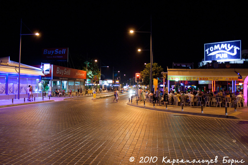 Город. В Айя-Напе вы не найдёте огромных небоскрёбов и суперсовременных торговых центров - ранее это была обычная рыбацкая деревушка, ставшая через некоторое время одним из самых весёлых мест отдыха в мире. И здания здесь соответствующие - 2-3 этажные постройки. Обычно, на первом этаже располагаются какие-нибудь заведения, а на втором проживают люди. В городе две основные улицы, на которых и кипит вся жизнь - это Nissi Road (та, где расположен МакДональдс) и Makarios Ave (начинается от порта и идёт вверх). Вдоль этих двух улиц и расположено подавляющее число всяких клубов/баров/кафе/ресторанов/магазинов и прочего. Сам город чисто молодёжный, хотя сюда приезжают отдохнуть и люди постарше - но им менее комфортно, я так считаю. Соответственно, часов с 18 начинается движняк по этим улицам - весь город на них выходит. Да и всего отпуска не хватит чтобы побывать в каждом заведении - это уж точно. Есть одна особенность - до 24:00 все тусуются по барам. После 00:00 открываются клубы и народ плавно перетекает туда. По национальному составу - 40% это русские и украинцы, 40% - англичане и ещё 20% - прочие национальности. И тут и там слышна русская речь.