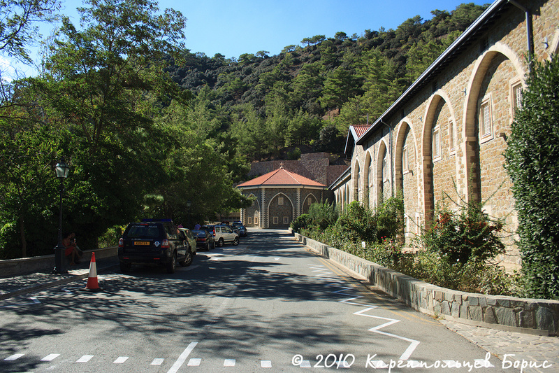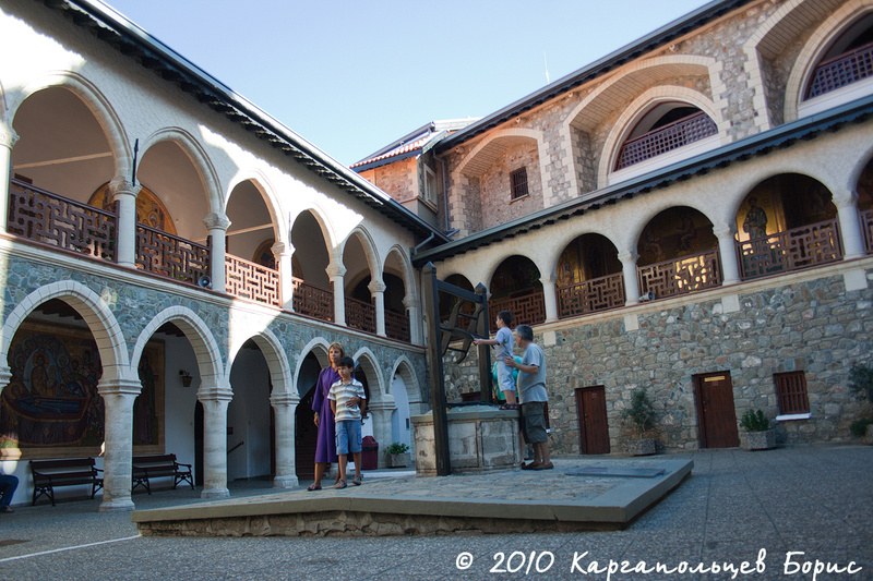 Остановка №3. Ещё выше в горах находится православный монастырь Kykkos, в который мы и направились. На входе всем женщинам выдают фиолетовые халаты, чтобы своим видом девушки не смущали монахов. Посещение монастыря, равно как и одежда, бесплатны. Во внутреннем дворе монастыря очень чисто - монахи за этим следят. Весь монастырь украшен изображениями святых и иконами. На территории монастыря есть церквушка и музей христианских реликвий. Вход в музей - 5?. Снимать фото и видео там запрещено. Вся съёмка - платная (10?). Этот музей стоит посетить - множество христианских икон, стилем написания отличающихся от того, к чему мы привыкли, много христианских артефактов - чаш, нарядов, копий, монет и прочего. Удивило, что большинство огромных икон вывешены совершенно свободно, без охраны и стеклянных колпаков, как у нас в музеях. В церкви в этот день не было служений. Интересно то, что итальянские семьи, если входят в церковь - то пока не перецелуют все иконы на алтаре, не остановятся).