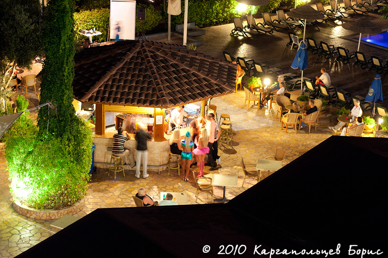 Завтрак/обед/ужин можно проводить не только в самом ресторане, но и снаружи на открытом воздухе. Столик для себя всегда можно найти - недостатка в этом нет. В районе 11-12 дня открывается бар у бассейна - выбор напитков всё тот же - алкогольные и безалкогольные, коктейли (нужно говорить название, либо, если бармен не знает такого, то можно рассказать как сделать - отказывают редко, если уж совсем не понимают), молочные коктейли, фреши и т.д. Если мы загорали и купались возле бассейна, то старались расположиться так, чтобы бармен нас не видел - и тогда набеги на бар совершались значительно чаще, по 2-3 напитка в одни руки "для себя". Вечером бар у бассейна превращается в бар у анимационной площадки, в ход идут преимущественно алкогольные напитки. Также вечером заступает на смену особо противный дядька, прозванный русскими туристами Гитлером за свою дотошность и нежелание вестись на разводы =) У него всё строго - один напиток в одни руки и только для заказавшего человека, нельзя напиток передать другому лицу, нельзя этим напитком разбавлять свои напитки и т.д. Но и его можно запросто обмануть - просто уходить с напитком в отель, где его зона видимости заканчивается.