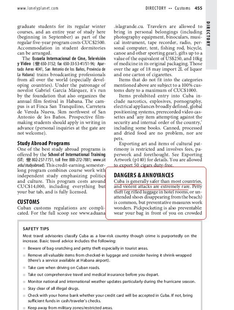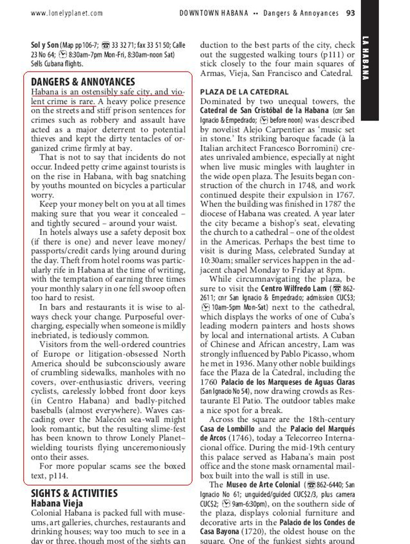 Ну так извини - в Рио на Копакабане/Ипанеме тоже безопасно. Днем. Однако лонька говорит четко и недвусмысленно: "после темноты на пляж - ни ногой".Причем тут Бразилия? Давай почитаем LP Cuba.