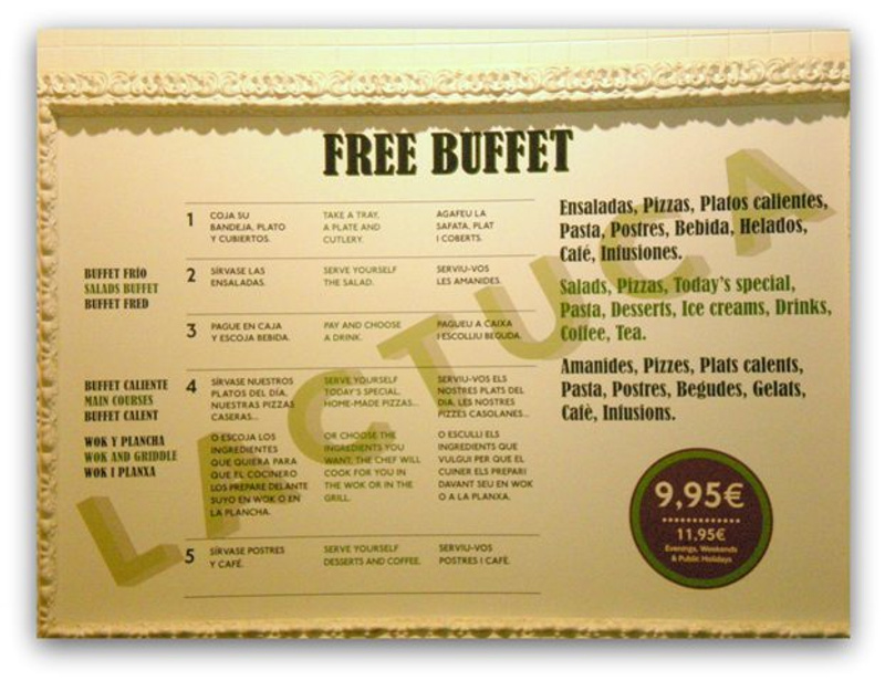 Шведский стол, всего 9,95 евро за тарелку (всего что Вам захотелось бы съесть), а вечером, в праздничные и выходные дни - 11,95 евро за тарелку .