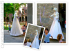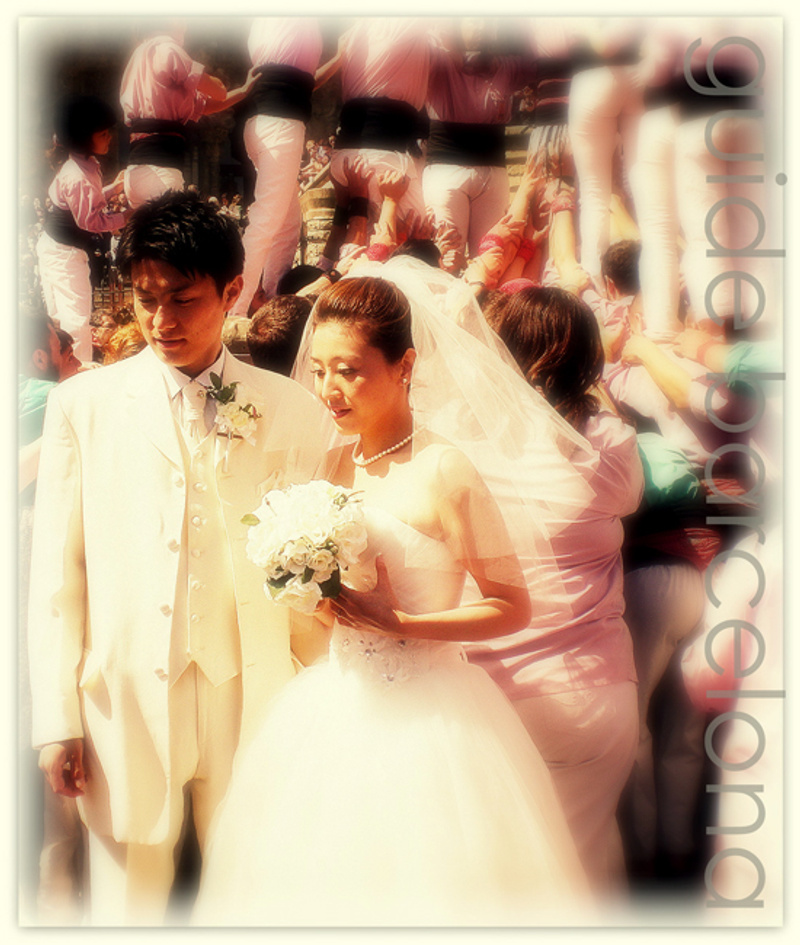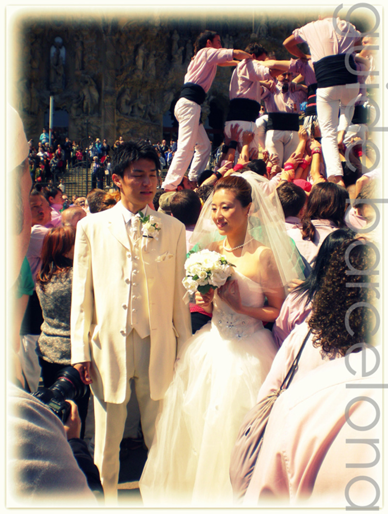 Свадьба на фоне La Sagrada Familia в период праздника Castellers (выстраивания "живых" башен)