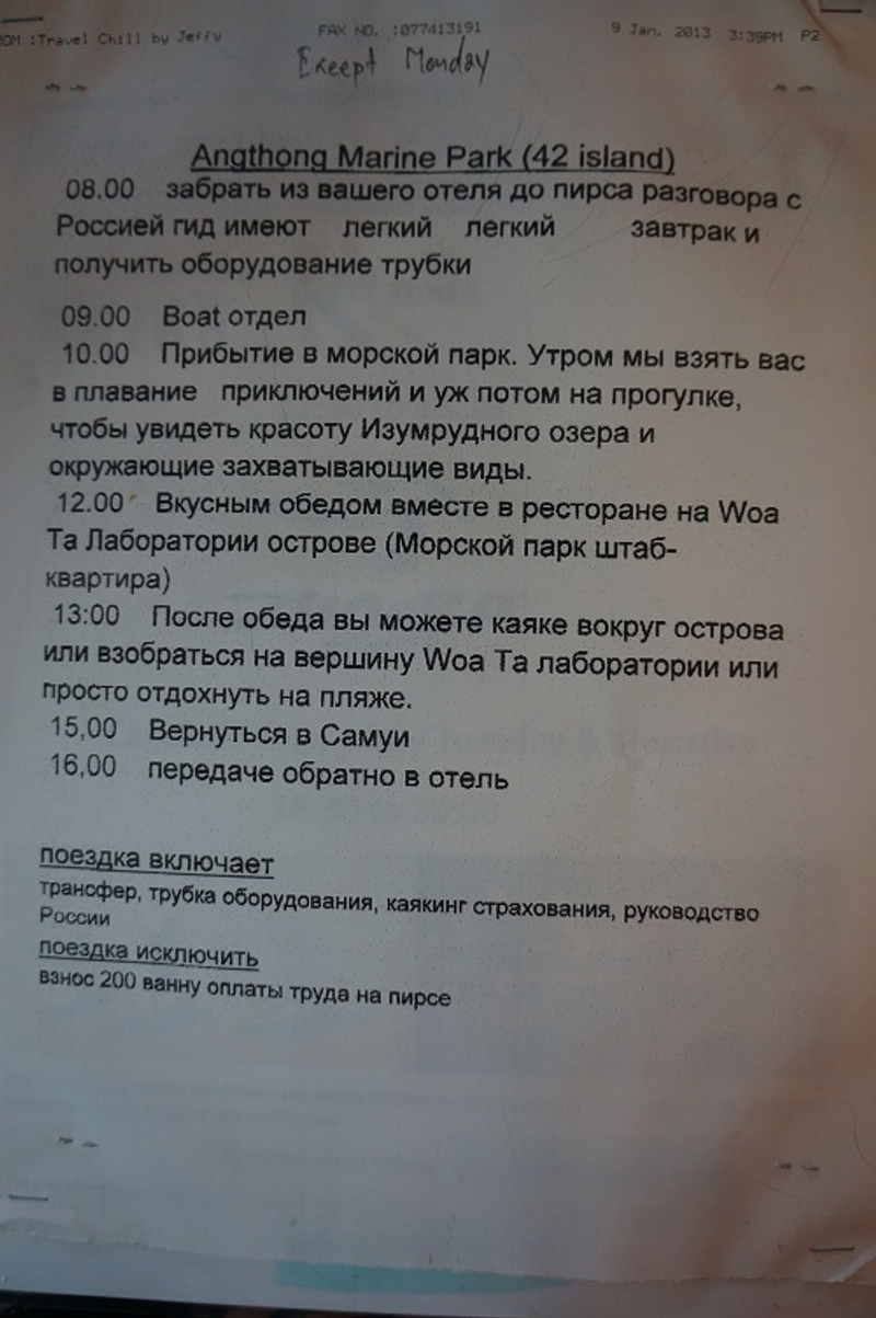 В ответ на: Ангктонг и Нангюань основные морские экскурсии, которые предлагают во всех агентствах. Сфотографировала их описание и расшифровку. сами еще не были, планируем позже. По ценам на буклетах указано было 2 100, покупали в подарок подруге - сторговали до 1 700 бат, возможно где то есть дешевле.