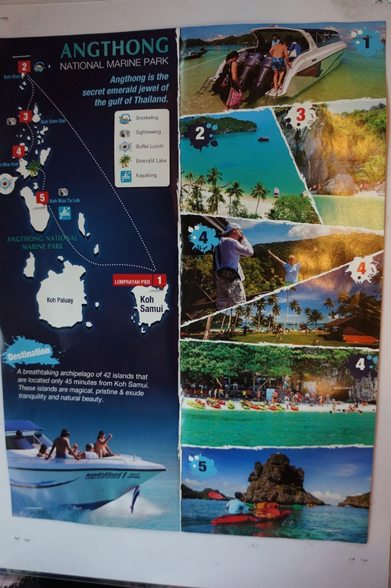 Ангктонг и Нангюань основные морские экскурсии, которые предлагают во всех агентствах. Сфотографировала их описание и расшифровку. сами еще не были, планируем позже. По ценам на буклетах указано было 2 100, покупали в подарок подруге - сторговали до 1 700 бат, возможно где то есть дешевле.