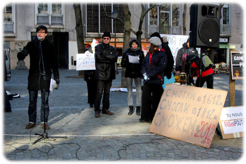 Плакат изначально внутрироссийский. Так что и думать нечего.То что он внутрироссийский понятно, но видит его на французском митинге, минимум забавно.