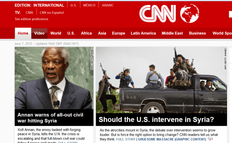 В ночь на 26 мая в сирийском городке Аль-Хула было убито как минимум 108 человек, в том числе 34 женщины и 49 детей. ..... СМИ практически единогласно утверждают, что это была военная операция сирийской армии......Наш соотечественник, доктор экономических наук Марат Мусин отправился в Сирию вместе со своей съемочной группой для того, чтобы предоставлять объективную информацию о происходящем. В своем журнале он сообщает: "25 мая 2012 года примерно в 14.00 крупные отряды боевиков атаковали и захватили городок Аль-Хула провинции Хомс..." http://maramus.livejournal.com/86425.htmlЦелью провокации было вызвать гнев и возмущение мирового сообщества и под нажимом в спешке «продавить» принятие нужной Западу резолюции СБ ООН по Сирии, открывающей путь военной агрессии НАТО». Эта провокация — повод к 3-й всемирной бойне, в которой уцелеть не сможет никто, они постараются... Россия в стороне от мировых вой никогда не была.