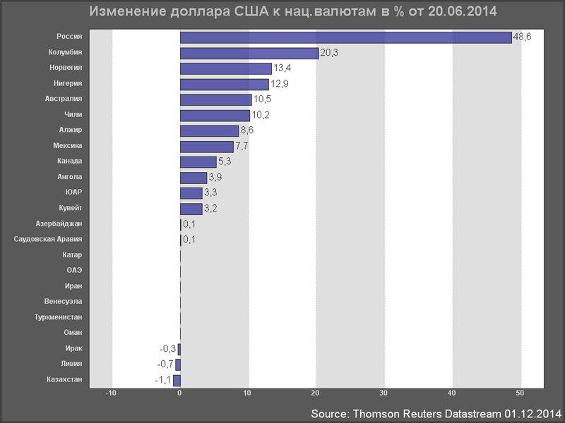 ... снижение стоимости сырья почти везде вызвало рост.Большинство сырьевых, нефтедобывающих стран не испытывает никакого обвала собственных валют, а кое-кто даже подрастает.
