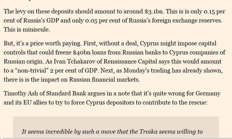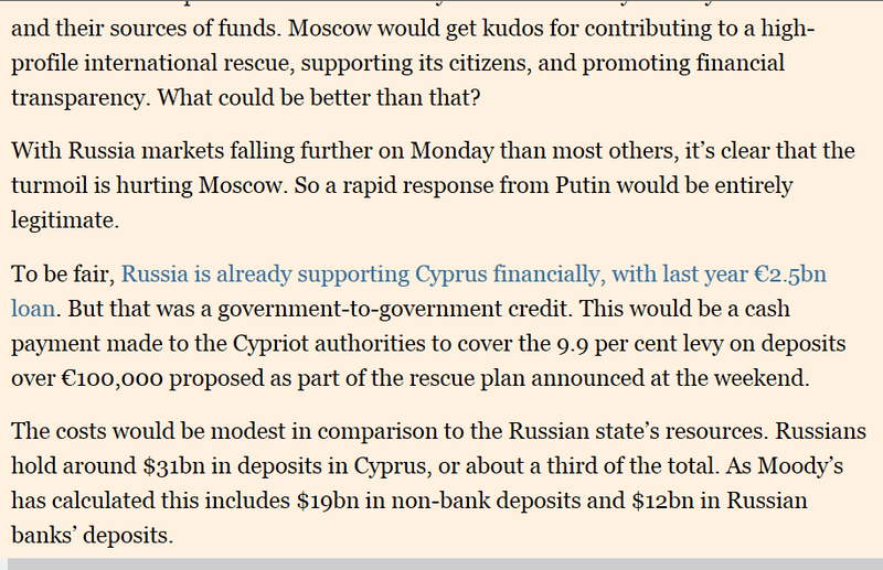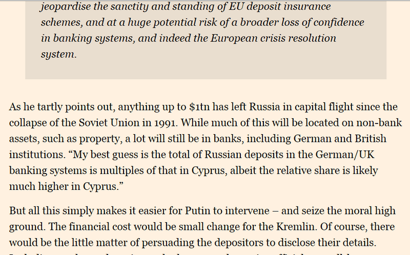 Евросоюз , Вы -правы. Решили отжать примерно $ 10 млрд российских денег просто так , мол кризис , на самом деле - еврокрысис .На Кипре только 20, т.е. 80% там еще кого то постригут. Но откуда и куда в первую очередь побегут капиталы спасаясь от уже ненадежных банков?