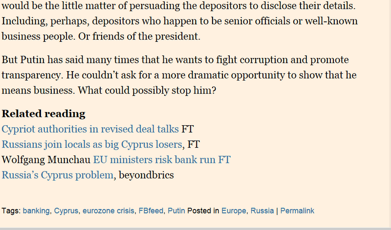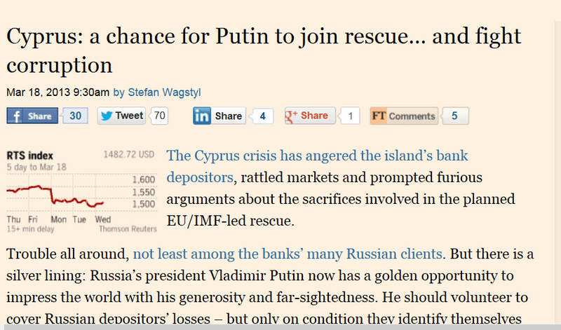 Деньги там особые - которые в РФ не "нужны". Потому - и мне не жалко.Тем не менее, события в Кипре на первых полосах. Кому-то очень жалко. Вопрос: "кому?"