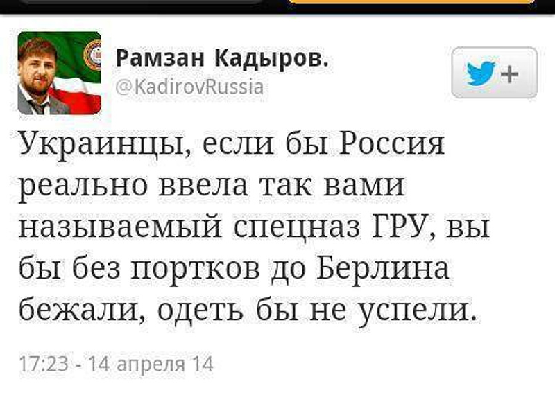 я слышал кто-то из чечни тоже хотел пАрЭзать всех врагов украинского народа...Не этот , случаем? Столько роликов в сети бравадных с поигрыванием мускулами и гортанными выкриками его бойцов и в твиттере понтов))