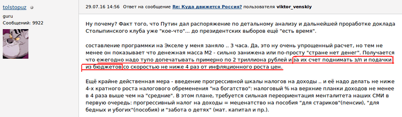 Голосовать надо за кандидатов, предлагающих существенный рост денежной массы (и отвязки её от долларовых поступлений за распродажу Родины) при инфляции в 4-5% в год (не более) за счет льготного и долгосрочного кредитования развития промышленности, с/х, услуговой сферы и пр. "производящих мощностей занятости" при условии существенного роста производительности труда по внедрению И доли зарплат "уже сейчас" И создании жестких защитных мер по перекачке рублей в доллары (валютный налог в 30-50%) и гибкого механизма таможенных пошлин по защите отечественной экономики от импореров-печенюшесников-предателей (кому что больше нравится: каждый выберет свое определение) с льготированием реинвестирования иностранной прибыли полученной на территории РФ в рублях. Дальнешая существенная помощь и защита больших семей в денежной форме.