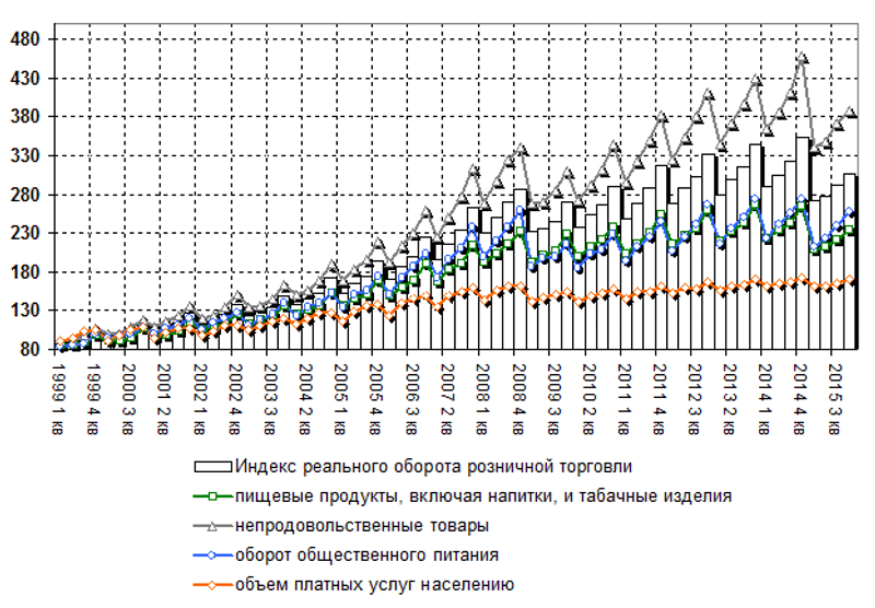 Торговый оборот внутри страны ПАДАЛ долгое время.Оборот внутренней торговли в физическом выражении РОС всю дорогу (рис "оборот")