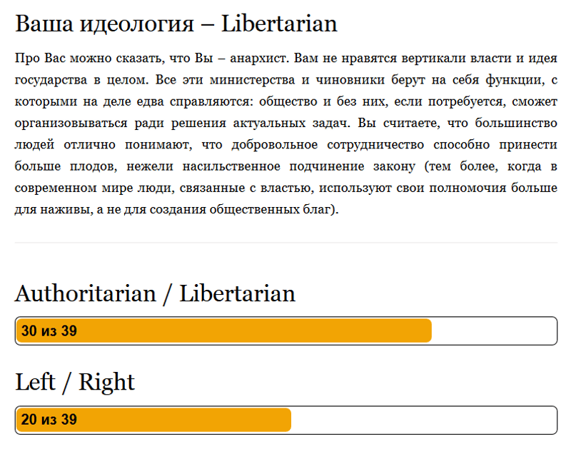 И... это конечно некоторое баловство, но как вариант оценки "со стороны". Довольно сильно контрастирует с самооценкой. Так?Нет. Текстовое описание вполне совпало с моими представлениями. Просто считаю что это правильней называть "Анархизм", т.к. именно он исповедует практики "саморегулирования", "самоорганизации" и вообще ответственного поведения лишности.